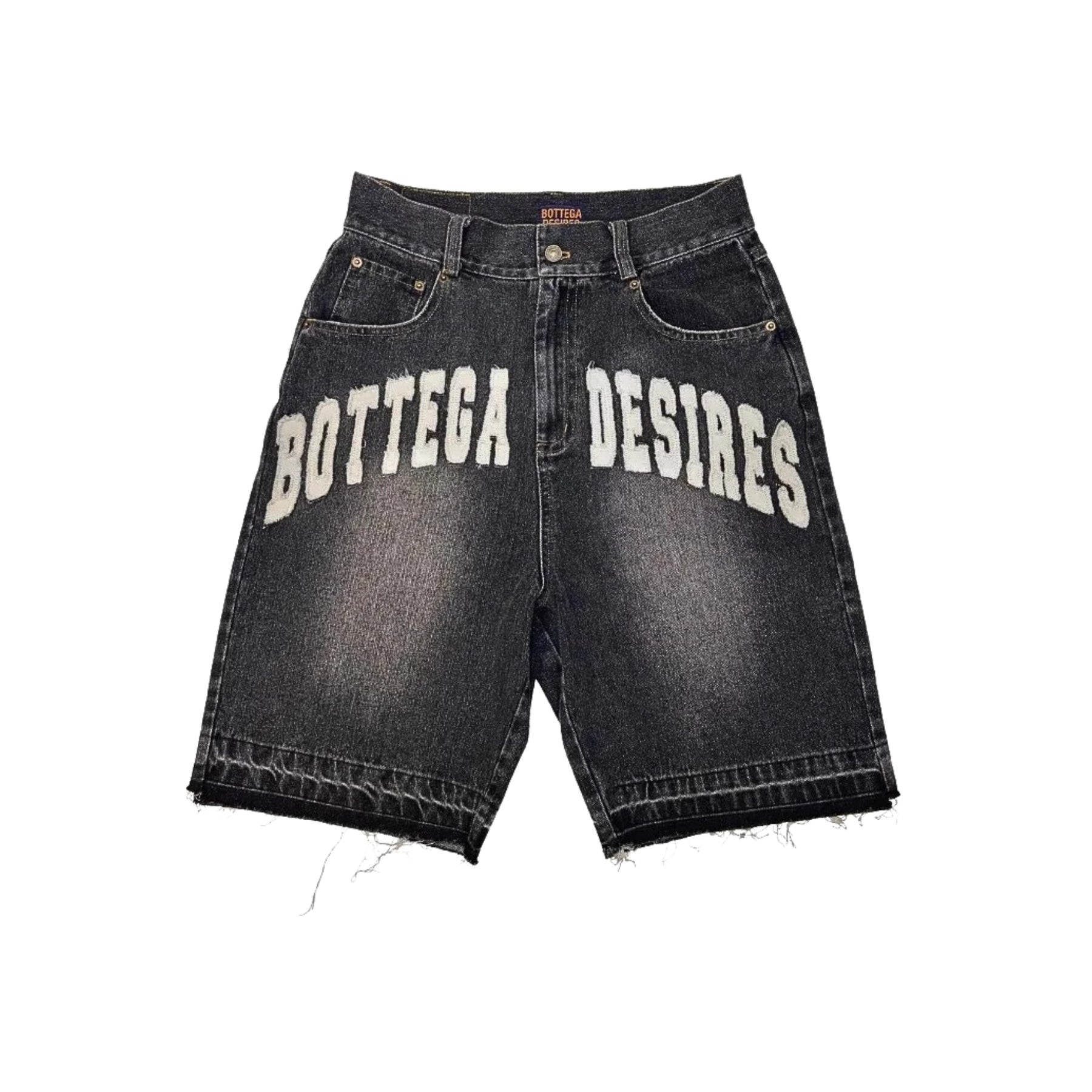 UNLOCK YOUR DRIP. These washed black denim shorts feature bold “BOTTEGA DESIRES” lettering with raw cut edges. The vintage fade gives them a worn-in look that feels effortless and street-ready.